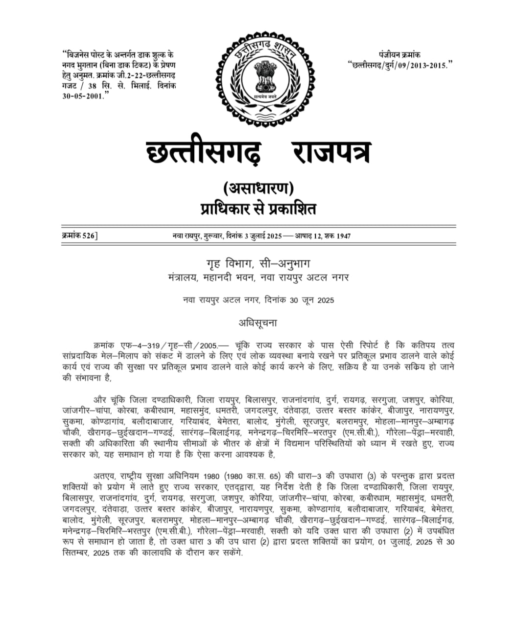 छत्तीसगढ़ सरकार ने हाल ही में 30 जून को राज्य में राष्ट्रीय सुरक्षा अधिनियम (NSA), 1980 के तहत जिलाधिकारियों को कार्रवाई करने का अधिकार दिया है। यह कदम राज्य में कानून व्यवस्था और सांप्रदायिक सौहार्द बनाए रखने के उद्देश्य से उठाया गया है।