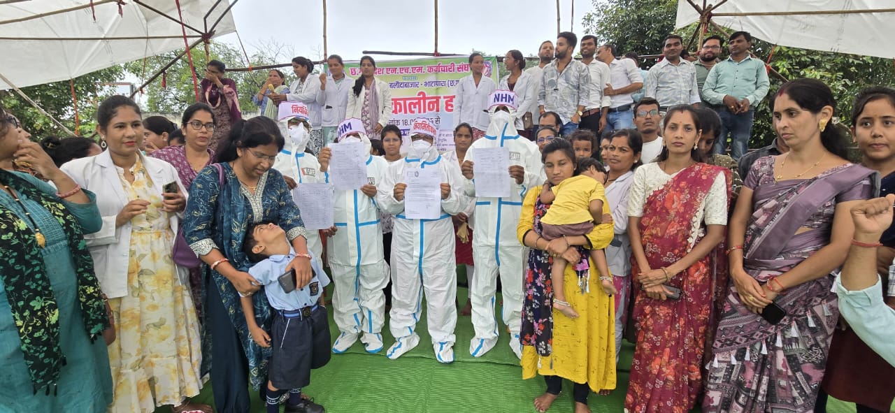 छत्तीसगढ़ बलौदाबाजार दशहरा मैदान की यह तस्वीर सिर्फ एक साधारण धरना-प्रदर्शन की नहीं है, बल्कि यह तस्वीर छत्तीसगढ़ NHM स्वास्थ कर्मियों की है जिनके हाथों में आम गरीब मरीजों के जीवन की डोर होती है वो खुद के जिन्दगी के लिए मजबूर है बलौदाबाजार जिला मुख्यालय सहित प्रदेश के सभी 33 जिला मुख्यालय में राष्ट्रीय स्वास्थ्य मिशन (NHM) के कर्मचारी अपनी 10 सुत्रीय मांगों को लेकर तपती गर्मी और बिजली तड़कती बरसात में 30 दिनों से धरने पर बैठे हैं—