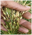 इथियोन 50% ईजी 400-500 मि.ली.प्रति एकड़ या इमामेक्टिन बेंजोएट 80-100 ग्राम प्रति एकड़ दवा का छिडकाव पेनिकल माइट के नियंत्रण में कारगार है , गंधी बग:- यह कीट धान की बालियों में दूध भरते समय बालियों से रस चूस लेता है | जिससे दाने काले पड़ जाते है।इस कीट से फसल को बचाव हेतु कीटनाशी दवा – इमिडाक्लोपिरिड 6 प्रतिशत + लैम्डासाइहेलोथ्रिन 4 प्रतिशत (एस.एल.) 300 मि.ली.प्रति हेक्टेयर का उपयोग करें । मुख्य रोग एवं बचाव के उपाय -शीथ ब्लाइट (चरपा) :- यह रोग धान में कंसे निकलने की अवस्था से गभोट की अवस्था तक देखा जा सकता है । रोग प्रकोपित खेत में पानी की सतह से आरम्भ होकर पर्णच्छद पर ऊपर की ओर फैलता है और अंततः पौधा रोगग्रस्त होकर झुलस जाता है । रोग लक्षण पर्णच्छद व पत्तियों पर दिखाई देते हैं । पर्णच्छद पर 2-3 से.मी. लम्बे, 0.5 से.मी. चौड़े भूरे से बदरंगे धब्बे बनते हैं । प्रारंभ में धब्बे का रंग हरा-मटमैला या ताम्र रंग का होता है । बाद में बीच का भाग मटमैला हो जाता है | इस रोग के नियंत्रण हेतु हेक्साकोनाजोल कवकनाशी (2 मि.ली. / ली.) या थायोफ्लूजामाइड का छिड़काव 10-12 दिन के अन्तर से करें ।