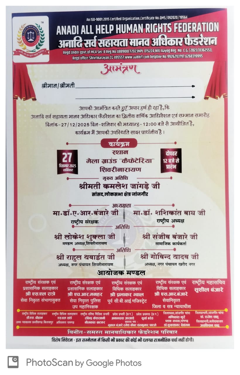 अनादि सर्व सहायता मानव अधिकार फेडरेशन इंडिया का द्वितीय वार्षिक अधिवेशन एवं सम्मान समारोह 27 दिसंबर को शिवरीनारायण में।
