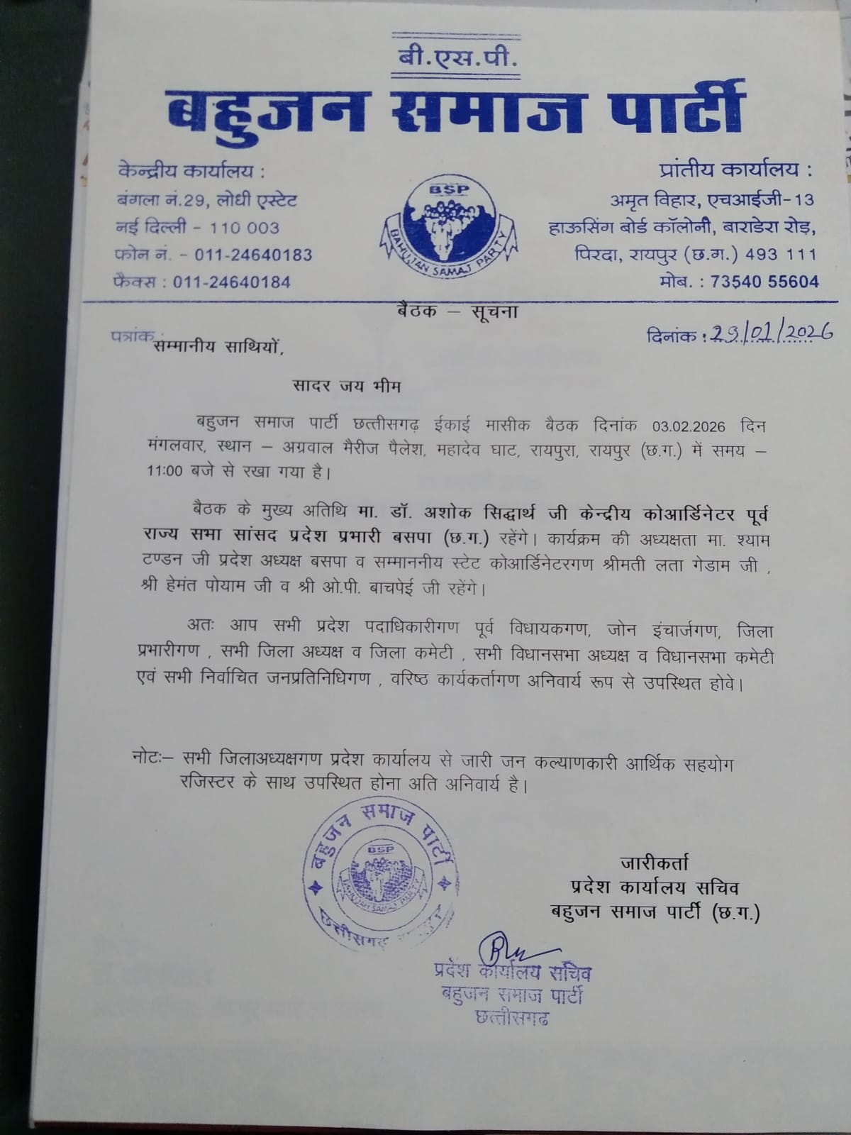 रायपुर 02 फरवरी 20256 । बहुजन समाज पार्टी छत्तीसगढ़ ईकाई की मासीक बैठक दिनांक 03.02.2026 दिन मंगलवार, स्थान अग्रवाल मैरीज पैलेश, महादेव घाट, रायपुरा, रायपुर (छ.ग.) में समय 11:00 बजे निर्धारित है। बैठक में मुख्य अतिथि डॉ. अशोक सिद्धार्थ केन्द्रीय कोआर्डिनेटर पूर्व राज्य सभा सांसद प्रदेश प्रभारी बसपा (छ.ग.) रहेंगे। कार्यक्रम की अध्यक्षता श्याम टण्डन प्रदेश अध्यक्ष बसपा व सम्माननीय स्टेट कोआर्डिनेटरगण श्रीमती लता गेडाम, हेमंत पोयाम व ओ.पी. बाचपेई रहेंगे। कार्यालय सचिव के अनुसार बैठक में प्रदेश के सभी पदाधिकारीगण पूर्व विधायकगण, जोन इंचार्जगण, जिला प्रभारीगण, सभी जिला अध्यक्ष व जिला कमेटी सभी विधानसभा अध्यक्ष व विधानसभा कमेटी एवं सभी निर्वाचित जनप्रतिनिधिगण वरिष्ठ कार्यकर्तागण अनिवार्य रूप से उपस्थित रहेंगे। कार्यालय प्रभारी ने सभी जिला अध्यक्षों को रजिस्टर के साथ उपस्थित होने को कहा है।